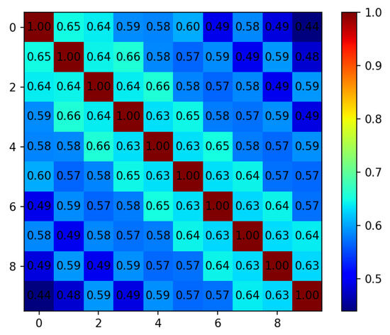 To analyze the correlation of traffic time series at different time intervals for the route point, Pearson’s correlation coefficients [24] were calculated between 10 adjacent time intervals for route point MAMSI, with each time interval spanning 15 min. For instance, when calculating the correlation between the 1st and 2nd time intervals, the two sets of traffic time series data used were and . The results of the Pearson’s correlation coefficient calculations for the 10 time intervals are shown in Figure 5, indicating a strong correlation between adjacent time intervals. As the distance between time intervals increases, the correlation between traffic time series gradually weakens.