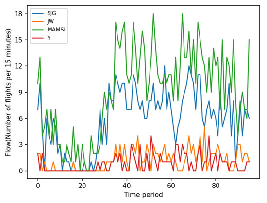 Considering the topological network structure, we selected four typical route points for spatial feature analysis. As shown in Figure 1, the four route points, SJG, MAMSI, JW, and Y, are all located near the geometric center of the sector and serve as crossing points of flight trajectories. They exhibit similarity in their physical spatial distribution. Building upon this, Figure 6 displays the traffic distribution of these four typical route points at various time intervals throughout a typical day. In Figure 6, the traffic distribution at each route point shows spatial variations, indicating differences in traffic volume and trends during different time intervals. For example, the traffic at waypoints SJG and MAMSI is significantly higher than at waypoints JW and Y. However, within these differences, there are also similarities.