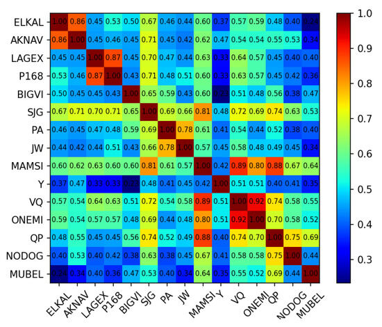 We calculate Pearson’s correlation coefficients between traffic flow time series of the 15 route points within the ZGGGAR22 sector for all 96 time intervals throughout the day on 1 March 2019. We select any two waypoints, for instance, ELKAL and AKNAV, and calculate Pearson’s correlation coefficients for the traffic flow time series. The two sets of time series data used for calculation are and . The results of Pearson’s correlation coefficients for the time series of the 15 route points are shown in Figure 7. In combination with Figure 1, it can be observed that the traffic flow time series of adjacent and directly connected route points exhibit stronger correlation. Additionally, there is a strong correlation between the traffic flow time series of route points that are not directly connected but functionally similar (different locations share similarities in their geographical features, purposes, or services), such as between ELKAL and LAGEX, despite not being directly connected, both serve as sector boundary points. Conversely, route points that are not adjacent and not directly connected tend to have weaker correlations in their traffic flow time series.