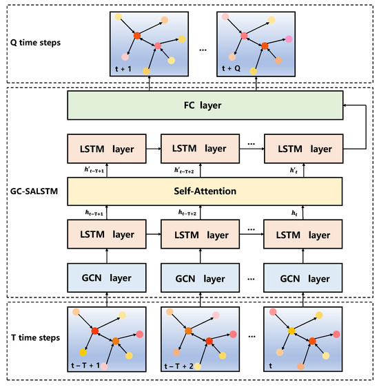 To extract the spatiotemporal features of route point traffic data more accurately, a neural network model based on graph convolutional network (GCN) and self-attention based long short-term memory network (SALSTM) is constructed, referred to as GC-SALSTM. This model is designed for short-term route point traffic prediction. The framework of the model is illustrated in Figure 9, comprising a GCN module and a LSTM module based on the self-attention mechanism. Firstly, the input consists of the route network topology diagram and the features of each route point over consecutive time steps in the network. Then, the graph convolution module is employed to extract spatial features of the route point network. The LSTM module captures the temporal features of route point traffic, and the self-attention mechanism assigns different attention weights to each time step, further enhancing the prediction model accuracy. Lastly, a fully connected layer outputs predictions for the traffic at each route point over consecutive time steps.