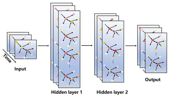 where Equations (9) and (10) represent the forget gate of the LSTM unit, with representing the output of the forget gate, representing the input to the current state (i.e., the output of the GCN module at time ), representing the output of the previous hidden state, being the weight matrix, being the bias term, and being the sigmoid activation function. Equations (11)–(13) represent the input gate of the LSTM unit, where and are the weight matrices, and are the bias terms, and tanh is the activation function. Equation (14) is used to update the LSTM cell state, where is the LSTM cell state from the previous time step, is the updated LSTM cell state at the current time step, and represents the Hadamard product. Equations (15) and (16) represent the output gate, where is the weight matrix and is the bias term.