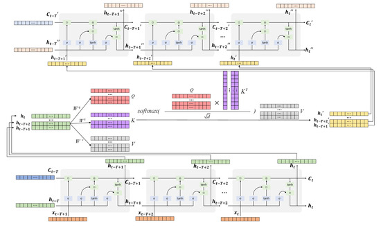 In Equations (17)–(19), represents the hidden state of the input time step output from the LSTM module; , and are weight matrices. In Equations (20) and (21), represents the variance of the matrix elements of ; matrixes and are defined as and , respectively. denotes the attention weights from time step to time step . In Equation (22), represents the feature vector after attention weighting at time step .