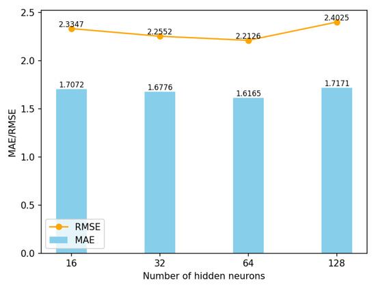 The number of LSTM hidden neurons affects the extent to which historical information is memorized, significantly impacting the model’s predictive results. To select a suitable number of LSTM hidden neurons, experiments were conducted with different numbers of hidden neurons (16, 32, 64, 128) for comparison. The results of the model’s MAE and RMSE are shown in Figure 12.