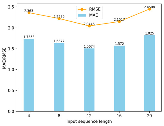 The output sequence length of the model in this paper is 4, predicting the future one-hour route point traffic flow. By testing different input sequence lengths of the model (4, 8, 12, 16, 20), it allows us to compare the prediction results to find the optimal input sequence length.