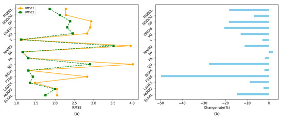 Figure 16a presents the RMSE of the model predictions at each waypoint when considering only the input parameter of flow and when considering two input parameters, namely the flow and network efficiency loss rate. Figure 16b illustrates the rate of change in the RMSE at each waypoint. In Figure 16a, RMSE1 refers to the prediction error of the model when the input metric is only the flow rate, while RMSE2 refers to the prediction error of the model when the input metrics are both the flow rate and network efficiency loss rate. It can be observed that after adding the network efficiency loss rate indicator, the RMSE of 14 route points decreases to varying degrees. Only one route point (JW) shows an increase of 1.83%, which is within an acceptable range. It is evident that adding the route point network efficiency loss rate indicator considers both the connectivity and distance factors, incorporating additional spatial correlation information extracted from the route point network, thereby enhancing the model’s prediction accuracy.