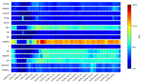 The traffic flow at each route point within the sector comprises the data that possesses both temporal and spatial attributes, displaying significant operational periodicity, spatiotemporal correlations, and other characteristics. To balance time precision and data density, we have chosen a 15 min interval to analyze traffic flow at route points. Figure 3 illustrates the distribution of traffic at 15 route points in sector ZGGGAR22 during typical days, segmented into 15 min intervals. It reveals that, in the temporal dimension, there is a similarity in the trend of traffic variation at different route points throughout the day. In the spatial dimension, significant differences exist in the traffic volume at various route points. Therefore, analyzing the spatiotemporal characteristics of traffic flow at route points is crucial for subsequent traffic predictions. For analysis, MAMSI is selected as it represents the busiest typical route point within the airspace of the Central and Southern region airport group, with nearly a thousand flights passing through daily, involving airports such as Guangzhou, Shenzhen, and Zhuhai.