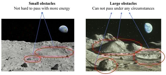 There are variable types of obstacles on the moon’s surface: small rocks, large rocks, small craters, and large craters. For small rocks and small craters, lunar rovers can go across or step in and out easily, which only needs more energy. Therefore, they would not inhibit any action except consuming more energy for this kind of obstacle. In contrast, large rocks and large craters present significant challenges and hazards. Once rovers come across or come near, they may not move across, even fall off the craters, or must move backward because of the lack of power, which influences the function of the rovers. These two obstacles are about to be bypassed, as shown in Figure 2. When confronted with small obstacles, rovers may opt to maneuver around them or proceed directly through them, albeit at the expense of increased time and resource consumption. However, when encountering large obstacles, rovers must prioritize navigating around them to ensure a safe pass.