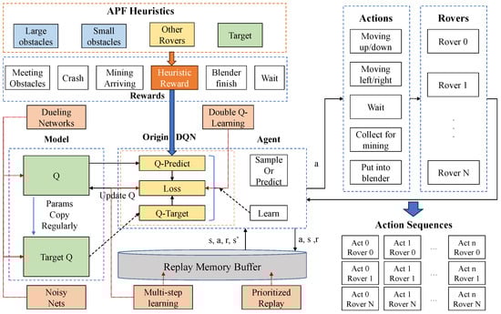 Our planning problem has discrete action and state spaces where DQN is widely used. We choose the most developed DQN algorithm, called Rainbow DQN [22], which combines several improved DQN algorithms into one algorithm and performs well in multiple environments. The basic framework of Rainbow DQN and the combination of heuristics of Section 3.4 are shown in Figure 3. The agent samples or predicts an action from the environment in which the state and the reward are generated and stored in the replay memory buffer with the action. Then the agent gains from the buffer and calculates the two Q-values through the network parameters and , respectively, then the loss. Loss generates the gradient and updates the Q-Predict Net through back-propagating. Q-Predict Net and Q-Target Net share the same network structure so that Q-Predict Net can update itself through parameter copying. The heuristics are considered to be rewards in the training period, which leads rovers away from obstacles and each other while leading to the targets.