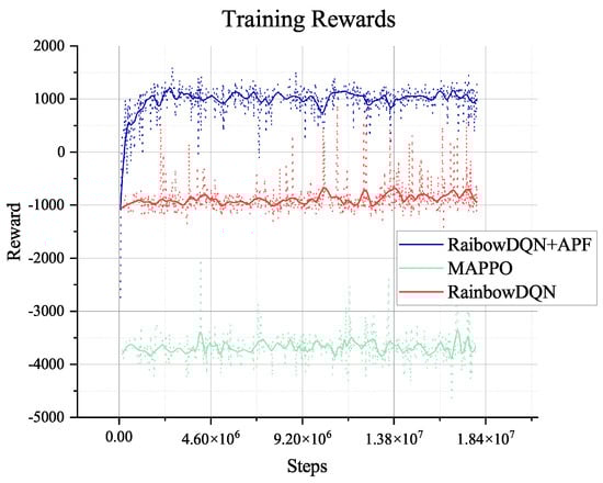 Our simulation code is written in Python 3.10 and benefits from Tianshou 0.4.9 and PyTorch 1.11 framework. The coding and running platform is a PC running Windows 10 with Intel Xeon Platinum 8269CY@2.50 GHz, 32 GB RAM, and NVIDIA GeForce 3080ti. Parameters for training in Rainbow DQN modified through cycling action for multi-agents are shown in Table 3. Table 4 shows the reward values in different situations. Heuristics are also added to the rewards with the rate of for repulsive potential and 5 for attractive potential. Eight threads have been used for training. Training has been run times. Although the sum of the target reward is , moving across small obstacles will gain rewards below 0, so we consider convergence as the sum of the reward exceeding 1000.