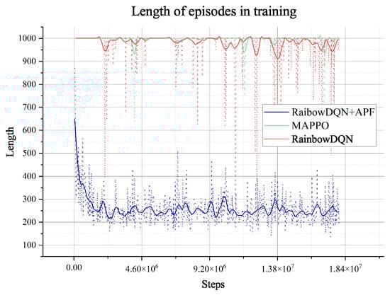 Table 6 illustrates the statistics of paths from the RL-trained agent and the multi-agent A* with improved obstacle avoidance. Our RL with APF training and planning method performs better than multi-agent A* from all aspects except the standard derivation of the path length. It performs better, especially with the calculation and responding duration. The multi-agent A* needs to plan separately, combine paths, and solve conflicts among paths, which costs more time than the direct decisions made by the RL agent.