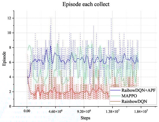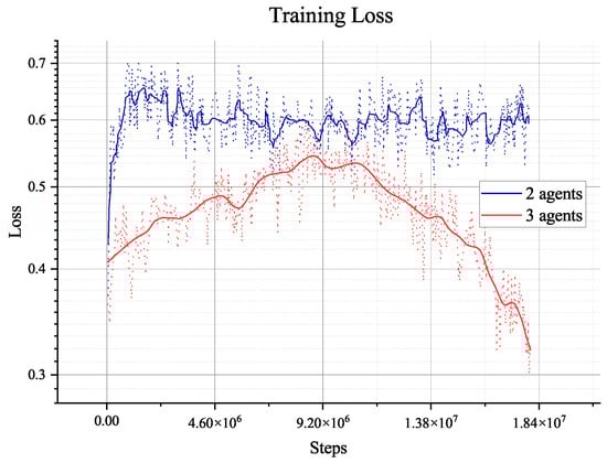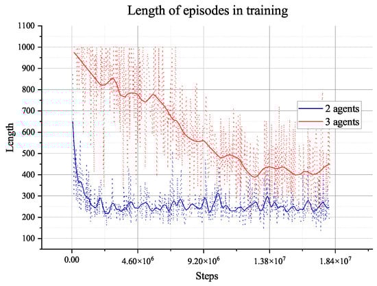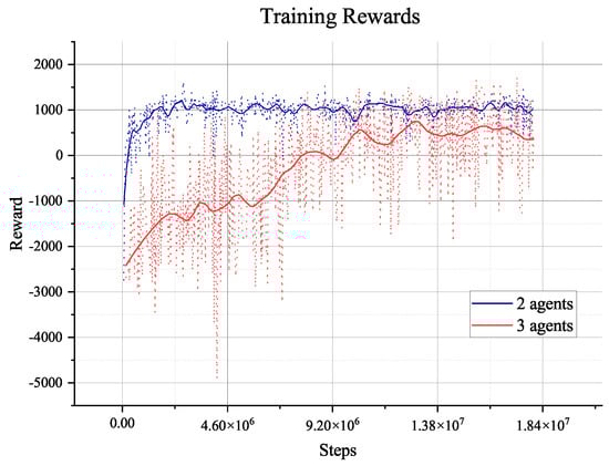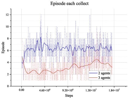 The proposed method based on Rainbow DQN for task and path planning can also be adapted to more than two rovers. However, one single trained agent can only solve the planning problem of one certain number of rovers, which means solving three rovers’ planning problems requires additional training. So, we trained again for a three-rover task and path-planning problem with the proposed heuristics and randomly generated maps. Comparisons between two and three-rover training are demonstrated in Figure 23, Figure 24, Figure 25 and Figure 26.