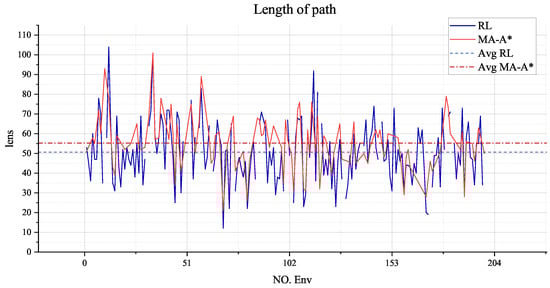 Figure 16 shows the path lengths planned by RL and A-Star in a simulated area of size . The agent in RL achieves a success rate in task planning and path planning in 200 validation environments. Most of the path lengths from A-Star are shorter than those from RL because the agent in RL has been trained for resource optimization by reducing the number of moves across small obstacles. The agent has also been designed to shorten the path, and the average RL length (50.58) is slightly lower than A-Star’s (55.26). This means that in the path planning part, the RL can plan an acceptable path compared to the path of A-Star.