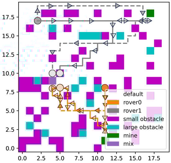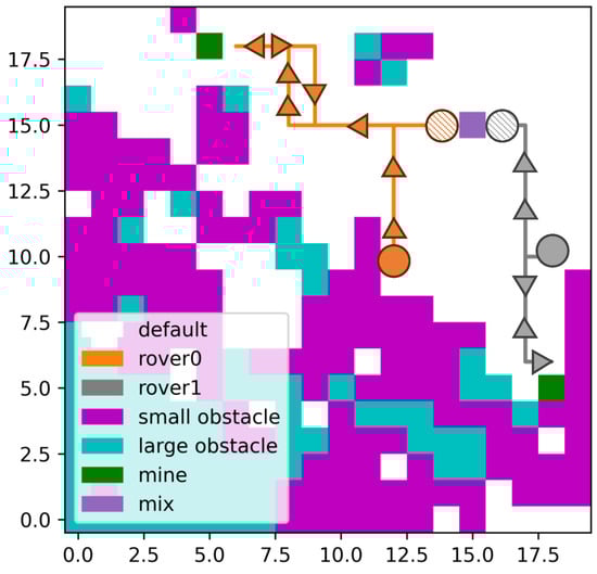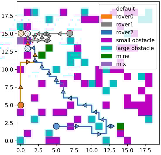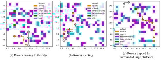 Second, another contributing factor to planning failures lies in the proposed heuristic’s inability to consistently fulfill the current target under all circumstances. When rovers move into an area encircled by large obstacles, a conflict emerges between the heuristic guiding obstacle avoidance and the heuristic directing movement toward the target. Consequently, the rovers persist in attempting to advance towards the large obstacles despite the impossibility of reaching them, resulting in gaining a punishment reward. Furthermore, it did not find a better solution because of the local optima in training. Some of the failure planning results are indicated in Figure 21.