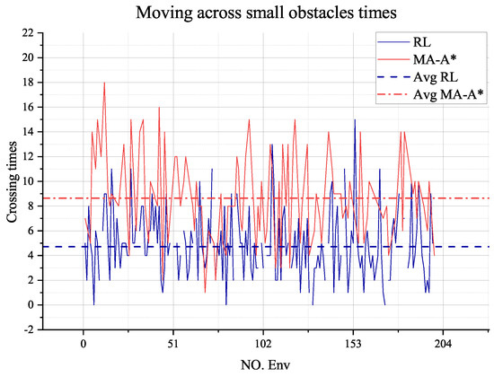 Figure 18 shows how often the rovers move across the small obstacles, indicating the quality of the path-planning solution. It appears that most of the solutions from the RL agent have fewer small-obstacle crossing times than the A-Star solution. The average time of the RL plan is also less than that of the A-Star plan. For validation environments, the RL agent performs better than the A-Star.