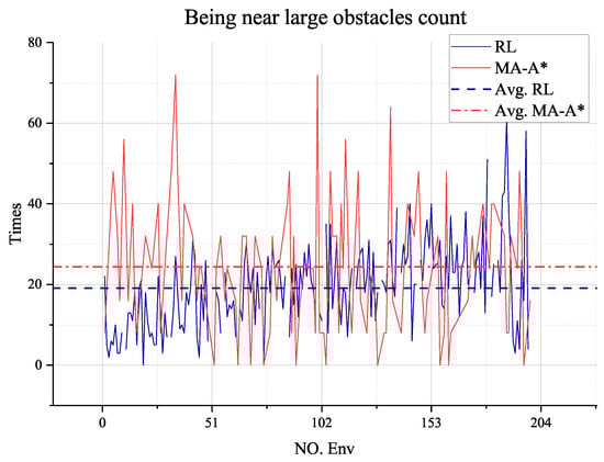 Figure 19 indicates the dangerous situations in which the algorithm leads the rovers. The number of RL agents that perform better is greater than the A-Star ones, and the average is better. In some of the validation environments, A-Star performs better because the RL agent only has partially observed information. Even if it can avoid large obstacles, sometimes it will still be near large obstacles.