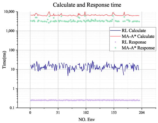 Figure 20 shows the entire planning time and response time of the two methods. Here, we define the response time as the time until the agent can generate one action or path after the rovers complete tasks. The planning time of the RL agent also includes the planning time for collecting and delivering actions. The figure shows that even with the task planning time, the calculating time is still slightly lower than the A-Star, which only plans the paths. However, regarding the response time, the RL agent performs better than the A-Star method. Because the RL agent can generate one action according to the current state in the environment, the A-Star method needs to search till the target and then return the whole plan, which costs more time. Response time is valuable, especially in emergencies.