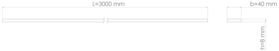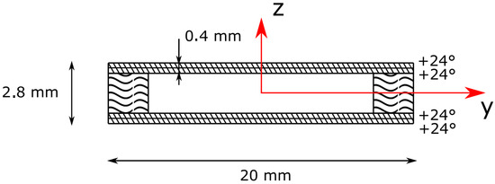 A numerical comparison was performed for a case with bending–torsion coupling; the reference structure is a box beam structure with a circumferentially asymmetric stiffness (CAS) laminated composite configuration. The structure was described in [37]; the section is represented in Figure 6. The beam was obtained with a unidirectional T700 carbon–epoxy layer bonded onto wooden spars with fibers oriented at . The structural box had the following dimensions: length, L = 522 mm; width, w = 20 mm; height, h = 2.8 mm; upper and lower panel thicknesses, t = 0.2 mm; mass per unit length, m = 1.095 × kg/mm; and torsional unit inertia, Ip = 4.75 × kg/mm. The mechanical properties of the material are listed in Table 2.