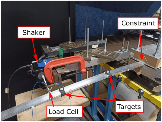 The acquisition was performed with a Polytec PSV-500 Laser Doppler Vibrometer (LDV) system, while the excitation was obtained with an electrodynamic shaker K200xE01. The shaker was placed at mm from the constraint, perpendicular to the beam axis as represented in Figure 5. The objective was to excite only the edgewise degree of freedom because edgewise and torsional characteristic frequencies are the most affected by flapwise deflection; moreover, the torsional modes should be visible only when the nonlinear coupling effect becomes important according to [1].