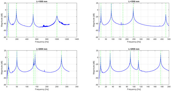 The Frequency Response Functions (FRFs) obtained through experimental modal analysis are reported in Figure 8. The experimental and numerical results for the characteristic frequencies are reported in Table 4. For a beam length equal to 1000 mm, the first torsional mode was not detected, while for a length of 1500 mm, the torsional mode was detected, but the peak was significantly smaller than the others. This confirms that the coupling between edgewise bending and torsion is weak for deformations below . On the other hand, for bigger deformations, the excitation of the edgewise degree of freedom provoked also the detection of the first torsional mode coupled with the edgewise bending mode.