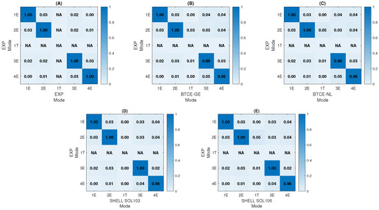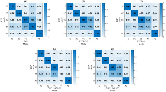 MAC L = 1000 mm, comparison with Experimental Mode Shapes: Auto MAC (A), BTCE-GE (B), BTCE-NL (C), SHELL SOL 103 (D), SHELL SOL 106 (E).