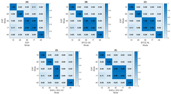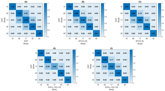 MAC L = 2000 mm, comparison with Experimental Mode Shapes: Auto MAC (A), BTCE-GE (B), BTCE-NL (C), SHELL SOL 103 (D), SHELL SOL 106 (E).