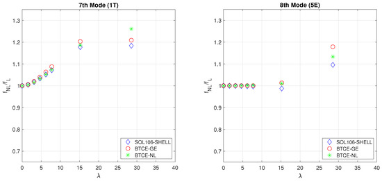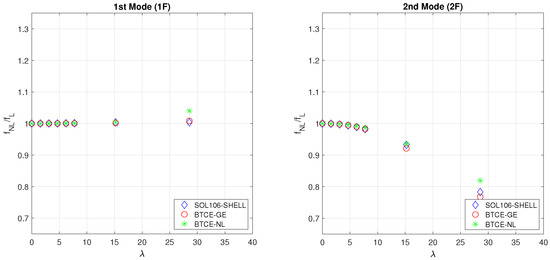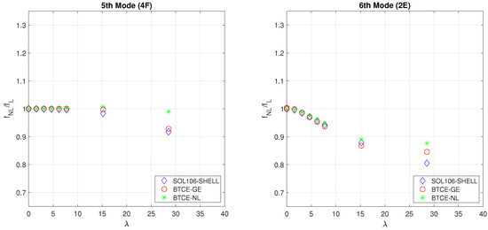 The results of the numerical modal analysis of the composite box beam structure described by [37] are represented in Figure 13, Figure 14, Figure 15 and Figure 16. Eight load cases were considered for a maximum deflection ; six of them correspond to a deflection below and can help to observe more precisely at which point the nonlinear effects cause the deviation from the linear results. The results of the simulation performed with the BTCE models were compared to the frequencies obtained with a SHELL model solved with NASTRAN SOL106. For this comparison, the first eight modes were investigated. In this case, the comparison was performed on the frequencies computed with the nonlinear models normalized with their linear counterparts computed for the undeformed configuration. With this method, the variation of the characteristic frequency is highlighted. The material orientation causes the flapwise bending–torsion coupling, while the deflection causes the edgewise bending–torsion coupling; for this reason, all the modes involve three degrees of freedom. However, one component of the eigenvector has a considerably higher value than the other; for this reason, the modes where flapwise bending is the major effect are denoted with the letter F, while the modes where the edgewise bending component is predominant are denoted with the letter E, and the mainly torsional modes are denoted with the letter T, as done previously.