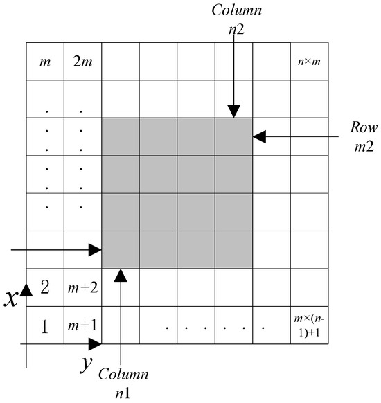 First, given a composite lamina size a × b × h, we mesh the lamina board into the acquired size, whose quantity is m × n × l, then locate the cubic damage edge on the lamina, supposing the damage area’s two vertex coordinates are (x1, y1, z1) and (x2, y2, z2), in which the damage area should be smaller than the lamina. Then, we can get this area’s element number in Figure 1, and in the first layer we have the following: