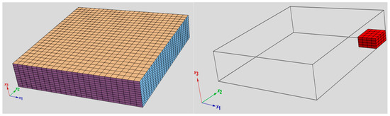 For the damaged model, assume there is a damage in the center of the upper surface of the plate with dimension , and the damage extends to a depth of . The damaged material stiffness coefficient is derived by multiplying the healthy element stiffness by 1 × 10−11. According to Equations (31) and (32), we have