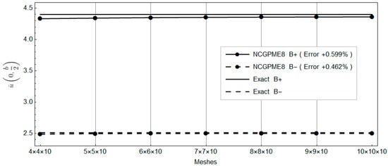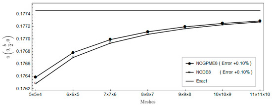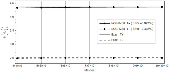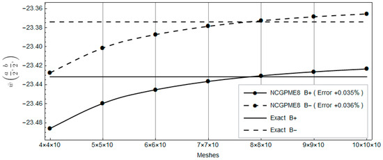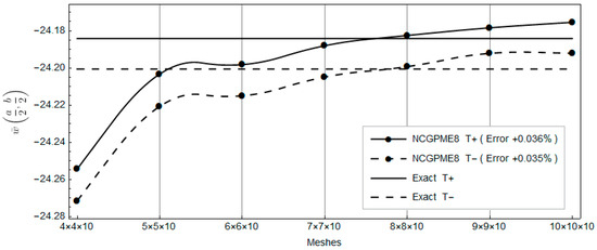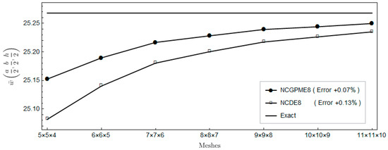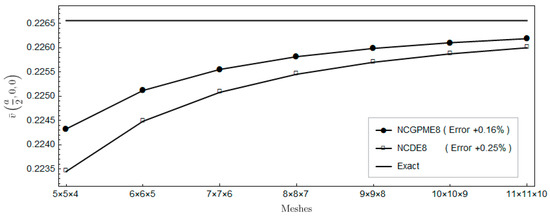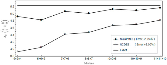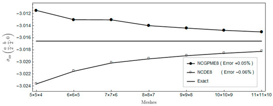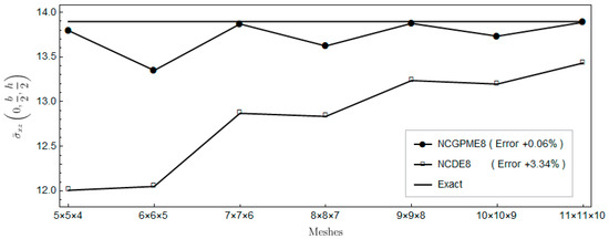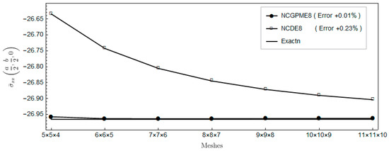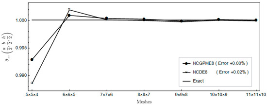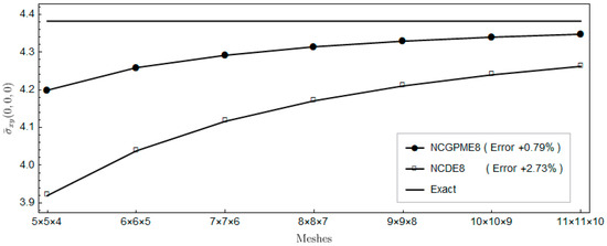 The nonconforming displacement element with eight nodes (NCDE8) in the commercially available software ABAQUS are obtained from the stresses of Gauss quadrature points by the extrapolation method [10]. Based on the results of the 11 × 11 × 10 mesh, the percentage errors of displacements and stresses illustrated in the legends in Figure 4, Figure 5, Figure 6, Figure 7, Figure 8, Figure 9, Figure 10, Figure 11 and Figure 12 are computed by (numerical-exact)/numerical, where “exact” denotes the exact solution and “numerical” is NCGPME8 or NCDE8. The exact solution is obtained by the method in reference [26].
