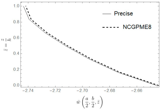 As shown in Figure 23, the non-dimensionalized size of the laminated plate is a = b = 10 h, with each layer having an equal thickness and a ply orientation of [0°/90°/0°]. The boundary conditions are the same as Example 1. Each layer of the laminated plate is idealized as a homogeneous orthotropic material. The material properties of the laminated plate in the main material direction are the following: Exx = 25.0, Eyy = 1.0, Gxy = 0.5, Gxz = 0.2, νxy = νxz = 0.25.