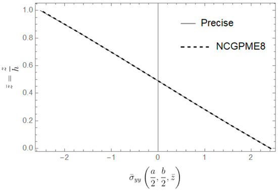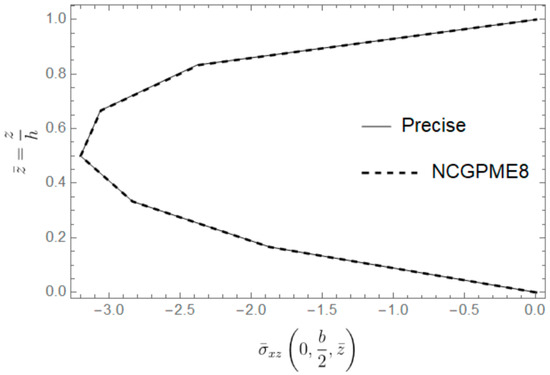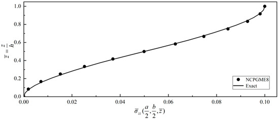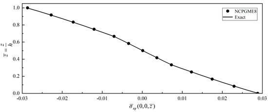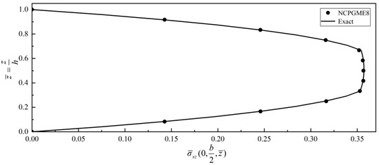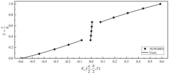 In this example, due to symmetry, only a quarter of the plate is discretized. A uniform grid of 12 × 12 × 12 is used to calculate the stress distribution along the thickness direction. Figure 24, Figure 25, Figure 26 and Figure 27 show four typical stress distributions obtained by NCGPME8 (λ = 0.75) as given by Equations (34) and (35).