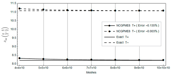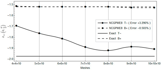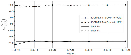 Clearly, with the increase in planar mesh, the rapid convergence of NCGPME8 can be observed in Figure 16, Figure 17, Figure 18, Figure 19, Figure 20, Figure 21 and Figure 22. It is noteworthy that the error in the solution for in-plane stresses is small, as evident from Figure 20 and Figure 21. Although the values for the upper and lower panels exceed the exact solution of Fan [26], the solution from this method becomes noticeably convergent with mesh refinement. In Figure 22, the error in the upper panel’s out-of-plane stress is within 3%, which is acceptable. This example verifies the correctness of the stress analysis method for laminated plates based on the eight-node non-conforming generalized partially mixed element and the accuracy of the algorithm in calculating in-plane stresses.