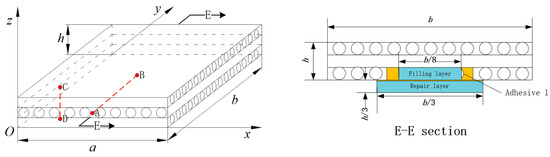 For the repaired plate model, after removing the damage, a filling layer with dimensions is first placed at the damaged location, and then an outer repair layer with dimensions is attached, and the gap is filled with adhesive. The material parameters of the filling layer and the repair layer are the same as the original layer of the repaired item. The E–E cross-sectional view in Figure 28 illustrates this configuration.