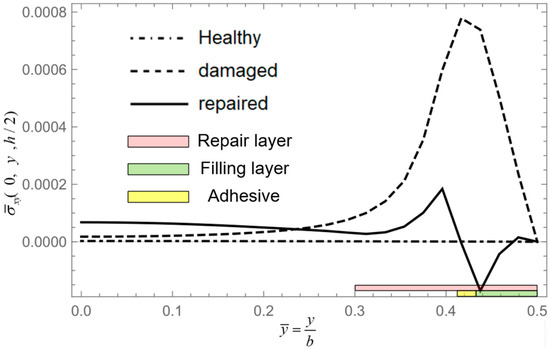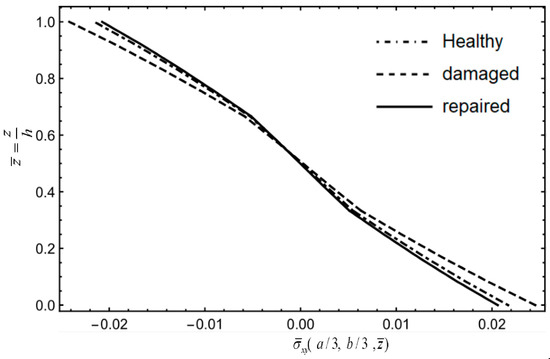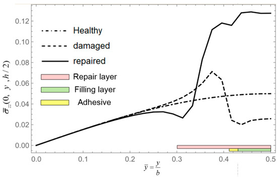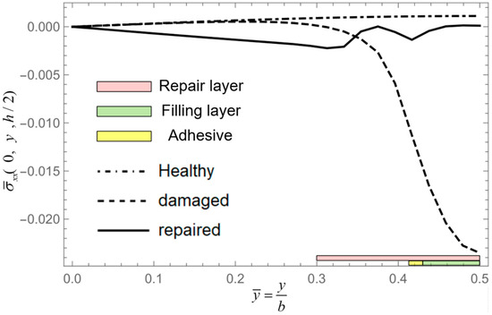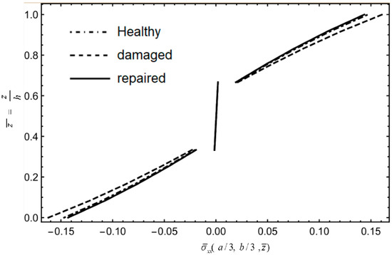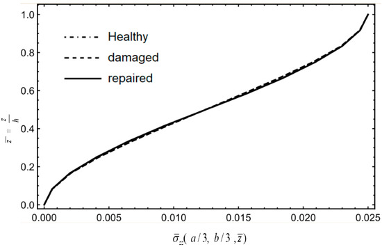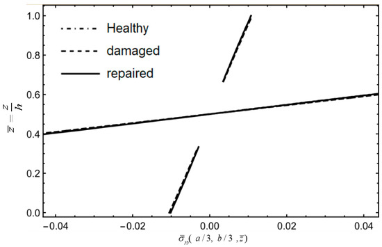 Given that the forgoing examples have demonstrated the convergence and accuracy of NCGPME8 and its ability to accurately solve internal stresses, this method is employed to analyze and compare composite materials, including healthy plates, damaged plates, and layered plates after step scarf repair. The models, boundary conditions, and loading methods used in this example are the same as in Example 4. Referring to Shen [30], the elastic modulus of the isotropic adhesive layer E= 1.077 GPa, shear modulus G = 0.40489 GPa, and Poisson’s ratio μ= 0.33. A 48 × 48 grid is used to divide the plate in the oxy plane, and the z-direction finite element model is divided into 12 layers for healthy and damaged plates, while the repaired plate was divided into 16 layers for a patch and was attached to the surface. The normalization method for parameters in this example is the same as in Equation (38).