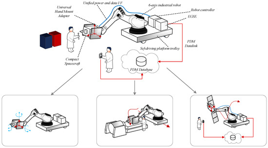 An industrial robot equipped with a universal interface at its hand mount avoids the need for major adaptations for different spacecraft prototypes to be integrated, see Figure 2. Due to the mechanics of the robot, an almost free positioning of the system during integration in all six degrees of freedom is possible, allowing better ergonomics for the operators without the need for additional clamping and repositioning. Furthermore, the automation capabilities of an industrial robotic system allow for the automation of several aspects of the integration and verification process. In combination with a self-driving platform trolley, the system can be freely moved in the integration facility, reducing the need for additional external logistics equipment.