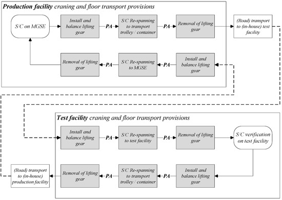 During the integration of prototypes, certain verification steps are planned at different milestones in order to verify the requirements, document the progress and verify the correctness of the assembly steps carried out. Depending on the verification needs, the spacecraft has to be removed from the MGSE and transported to the respective test facilities. These test facilities are not always available on-site, so the spacecraft may have to be transported longer distances by road or other means. This procedure accumulates many spanning- and consecutive-floor transport steps, which, in consequence, generate accompanying PA processes (Figure 4).