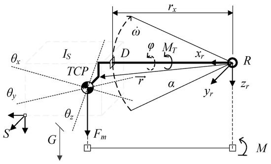 Figure 10 shows the basic physical principles for the MCI determination algorithm. For mass determination of a body of unknown CoG, a lever system with two known lengths, r1 and r2, is used to measure the torque at two measurement points: M1 and M2. The interface position D, as well as the coordinate transformation from robot to body R→S, is known.