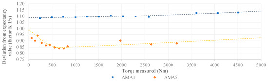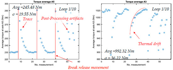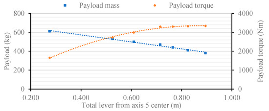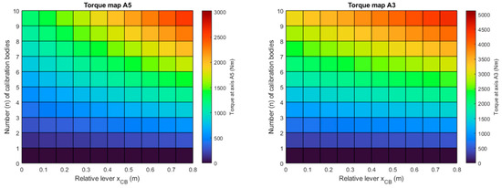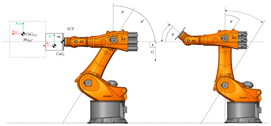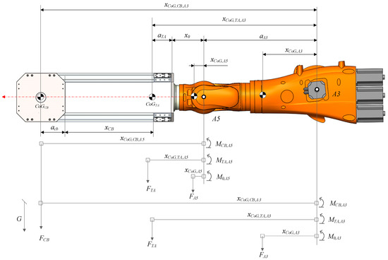 As can be seen, the mass of the DuT can be determined by its resulting torques. Since the respective levers from the TCP to the DuT CoG are, per definition, unknown, a relative measurement of the robot axis torques MA3 and MA5 is used. To reduce the measurement error, it has to be made sure that the gravity vector is aligned with the TCP axis perpendicular to the robot axes. The resulting torques are defined by the robot arm levers and the yet unknown CoG lever as per Equation (4):