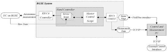 The system is locked programmatically in a software-defined envelope of ±45° around axis A1 to prevent any tip-over events and to limit the size of the hazard area when the robot is operated in automatic modes. The maximum achievable, stable horizontal range r in this setup is 2800 mm. For human–robot interaction, the robotic platform is operated in test mode T1 with the hand controller interface. In this mode, the maximum Cartesian speed of each element of the kinematic chain is limited to 200 mm/s with a mandatory Deadman control, thus minimizing the risk of injuries. For all envisaged verification tests, usage of the T1 mode is preferred. If it should be necessary to deviate to a fully automatic mode for an automated test sequence, the hazard area has to be cleared and cordoned off. A keylock in the control panel is used as a second security feature to prevent the accidental activation of automatic motions.