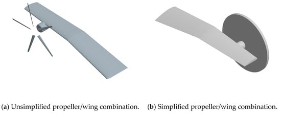Numerical methods for calculating propeller aerodynamics include the momentum source method [32,33], the multiple reference frame model [34,35], the sliding mesh [36,37], and the moving overset grids [38,39]. These methods exhibit increasing computational complexity. In this paper, our focus is solely on investigating the impact of propeller slipstream on the wing during the transition section, without delving into the intricate aerodynamic characteristics of the propeller itself. Consequently, to minimize computational complexity, we have opted for the momentum source method to simulate the propeller’s influence on the airflow.