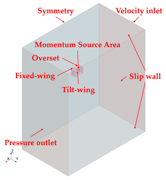 The schematic diagram of the computational domain and boundary conditions is shown in Figure 3. The size of the computational domain is 70 m × 42 m × 80 m, with the fixed section of the wing maintaining a constant angle of attack of 0°. The tilt section undergoes tilting, with a tilt angle of 0° defined in the fixed-wing aircraft mode and 90° in the helicopter mode. The incoming flow velocity remains constant during the tilting process and is set to 8 m/s, 15 m/s, 30 m/s, and 45 m/s. The inlet type is velocity inlet, the outlet type is pressure outlet, the wing root plane is set as symmetry, and the remaining surfaces are slipwalls.