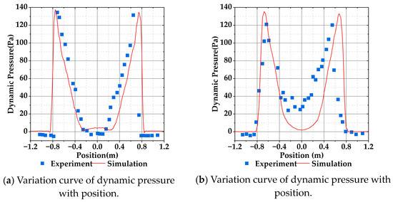 Figure 4a,b show the dynamic pressure comparisons at 0.215 R and 0.660 R below the rotor. The momentum source method accurately captures the trend of the rotor slipstream, consistent with the experimental results. However, the presence of the testing apparatus at 0.660 R caused flow blockage, which disrupted the test data.
