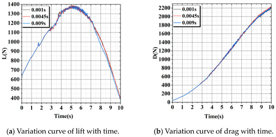 As shown in Figure 5a,b, the time-step independence verification was conducted under the return transition section condition, with an incoming flow velocity of 8 m/s, propeller rotation speed of 1400 RPM, tilt completion time of 10 s, and a total of 13,504,231 grid cells used for the calculations. The lift and drag of the wing were calculated at three different time steps. The compared time steps were 0.001 s, 0.0045 s, and 0.009 s. Based on computational speed and convergence, the final chosen time step for calculation was 0.0045 s.