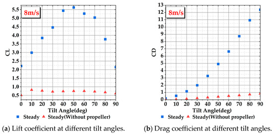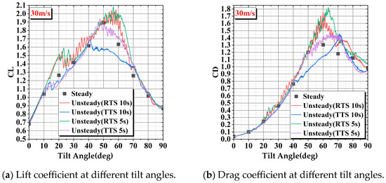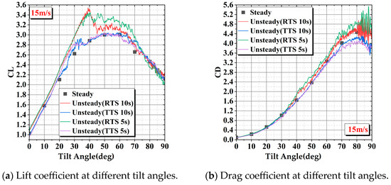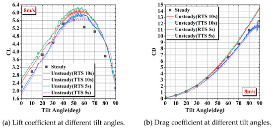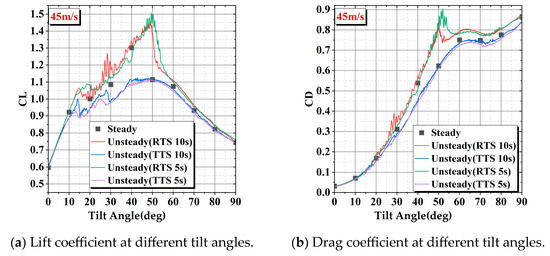 The steady calculation with a fixed tilt angle does not require distinguishing between the take-off transition section (TTS) and return transition section (RTS). Furthermore, as the tilt angle remains constant, the forces at each tilt angle are not influenced by time. The continuous unsteady calculations for tilting are conducted using two distinct sets of curves for the take-off and return transitions to realistically simulate the process of take-off and landing transitions. Due to the actual tilting process, the wing force curves vary for different tilting durations. To compare the steady calculations with the unsteady calculations, the data obtained from the unsteady state calculations were transformed from lift/drag versus time curves to lift/drag versus tilt angle curves. Figure 12, Figure 13, Figure 14 and Figure 15 show the wing lift/drag coefficient versus the tilt angle for incoming flow velocities of 8 m/s, 15 m/s, 30 m/s, and 45 m/s, respectively.