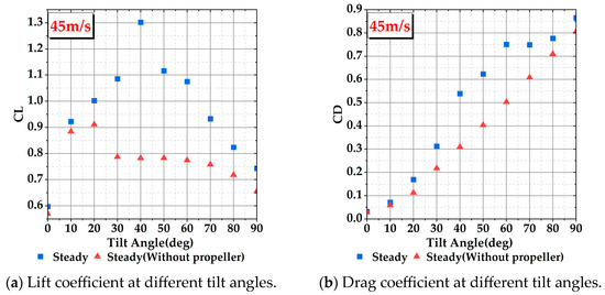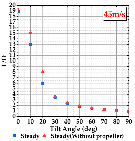 Comparison of lift/drag coefficients at each tilt angle of the wing with and without a propeller for an incoming flow velocity of 45 m/s.