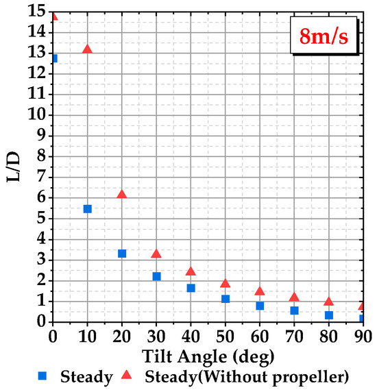 Comparison of lift/drag coefficients at each tilt angle of the wing with and without a propeller for an incoming flow velocity of 8 m/s.
