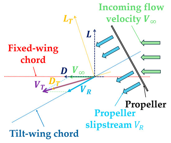 The increase in lift coefficient, drag coefficient, and stall angle is due to the slipstream effect of the propeller. For example, an incoming flow speed of 8 m/s and a tilt angle of 40° can be used. In the research process of this paper, when the aircraft is in the fixed-wing mode, the angle of attack is always 0°. After the tilt-wing starts to tilt, the tilt angle of the tilt-wing is equal to the angle of attack of the tilt-wing. A section of the tilting wing can be taken for analysis, as shown in Figure 10, which illustrates the flow and force on this section. Analysis of the figure reveals that due to the tilting wing tilting together with the propeller, the slipstream of the propeller combined with the incoming flow results in a deflection of the actual flow direction of the tilting wing. According to the definition of aerodynamics, the lift and drag of this section can be represented as and in Figure 10. However, in actual research, considering the aircraft as a whole, the actual directions of lift and drag should be represented as and in Figure 10. Decomposing the lift and drag in the local airflow coordinate system into the actual lift and drag directions reveals that a portion of the lift and drag in the local airflow coordinate system is decomposed into the drag of the aircraft airflow coordinate system, thereby causing the rate of drag increase to be faster compared to the rate of drag increase when the angle of attack changes in a typical fixed-wing aircraft.