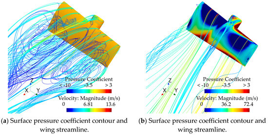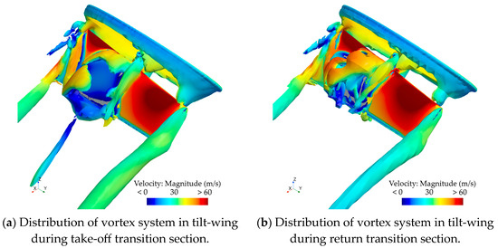To investigate the cause of the phenomenon shown in the above figure, the Q criterion is used to plot the vorticity distribution on the wing, and the vorticity surfaces are rendered using velocity. As shown in Figure 17a,b, the vorticity distributions on the wing during the take-off and return transition sections at a tilt angle of 40.5° are presented. By comparing the two figures, it can be observed that in Figure 17a, at the location where the wing’s negative pressure is lower, the vortices appear to break and detach. This indicates severe airflow separation on the wing surface at that location, leading to a decrease in flow velocity and a weakening of the negative pressure intensity in that area. On the other hand, in Figure 12b, separation vortices are also present on the left side of the wing, but they do not detach significantly from the wing surface. Therefore, the flow velocity on the wing surface is maintained at that location, resulting in a higher negative pressure intensity compared to the same position in Figure 12a.