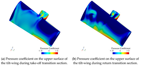 The pressure on the wing surface can intuitively reflect the magnitude of the aerodynamic force on the wing. Therefore, for the issue of differences in aerodynamic forces during the take-off and return transition sections of the tilt-wing aircraft, the wing surface pressure coefficient contour can be used for preliminary assessment. As shown in Figure 16a,b, the pressure coefficient contour on the upper surface of the wing during the take-off and return transition sections is presented at a freestream velocity of 15 m/s and a tilt angle of 40.5°. From the graphs, it can be observed that during the return transition section, the tilt-wing has stronger negative pressure at the left end of the power compartment. Consequently, it generates a greater aerodynamic force.