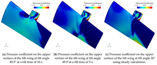 The tilt velocity has a significant impact on the take-off transition section when the incoming flow velocity is 30 m/s. Figure 18a,b display the pressure coefficient distribution on the upper surface of the wing at tilt times of 10 s and 5 s, respectively, with a tilt angle of 49.5°. Figure 18c presents a contour of pressure coefficients on the upper surface of the wing obtained from a steady calculation with a tilt angle of 50°. When comparing Figure 18a–c, the negative pressure intensity on the upper surface of the tilt-wing is significantly lower at a tilt time of 10 s compared to 5 s. The pressure coefficient contour for a tilt time of 5 s is similar to the contour obtained from the steady calculation. Due to the stronger negative pressure on the wing surface at this tilt angle, the aerodynamic force at a tilt time of 5 s is greater than that at a tilt time of 10 s. Comparing the changes in the vortex system of the wing at this position can more intuitively reflect the reasons for this result.